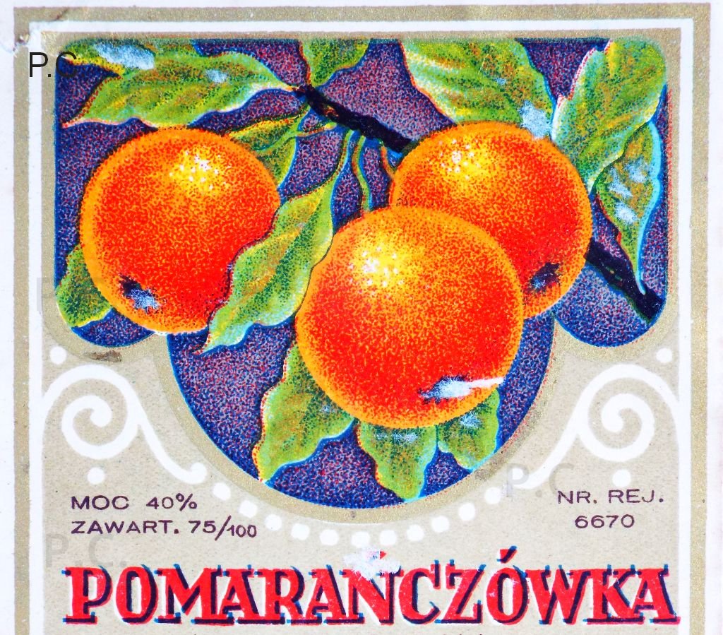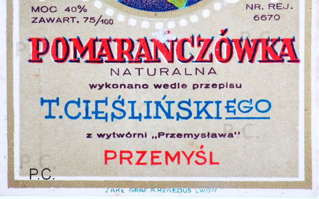 Moc 40% Pomarańczówka naturalna wykonano wedle przepisu T. Cieślińskiego z wytwórni „Przemysława” Przemyśl Zakł. Graf. A. Hegedus Lwów.