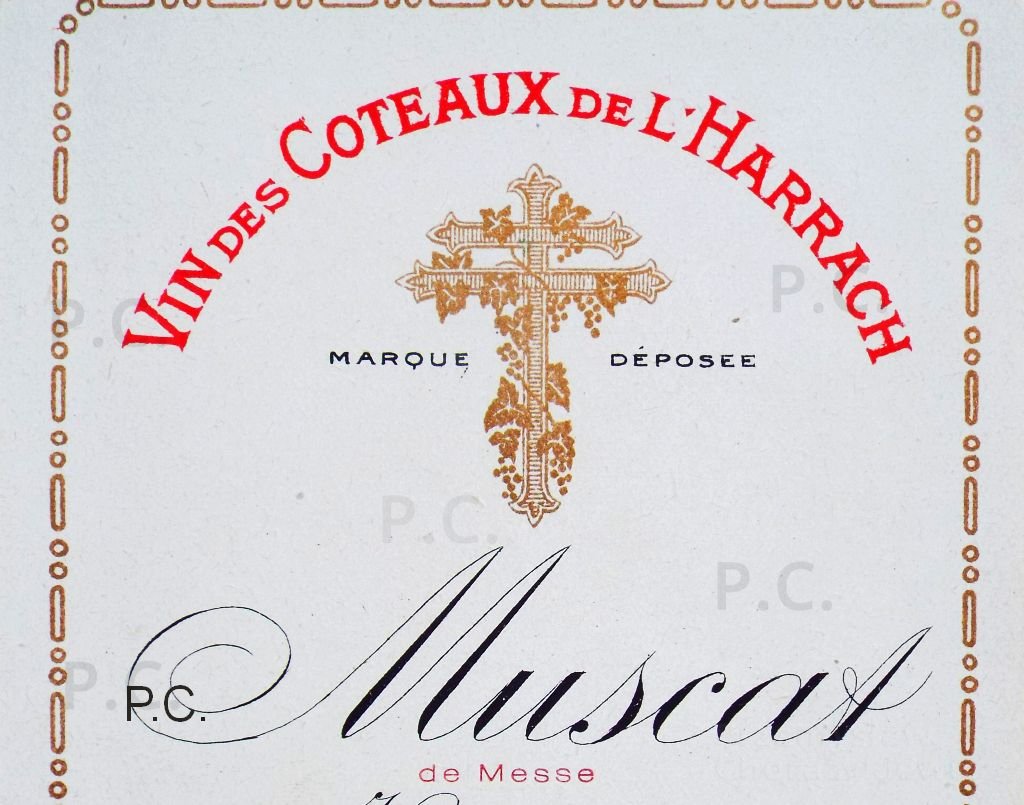 Vin Des Coteaux De L'Harrach Marque Deposee Muscat De Messe Vieux Extra Import Directe Par la Maison T. Cieśliński Przemyśl Fait sous la surveillance des Missionnaires d'Afrique (Peres Blancs) par la Societe Immobiliere et Agricole de l'Harrach A Maison-Carree (Algerie).