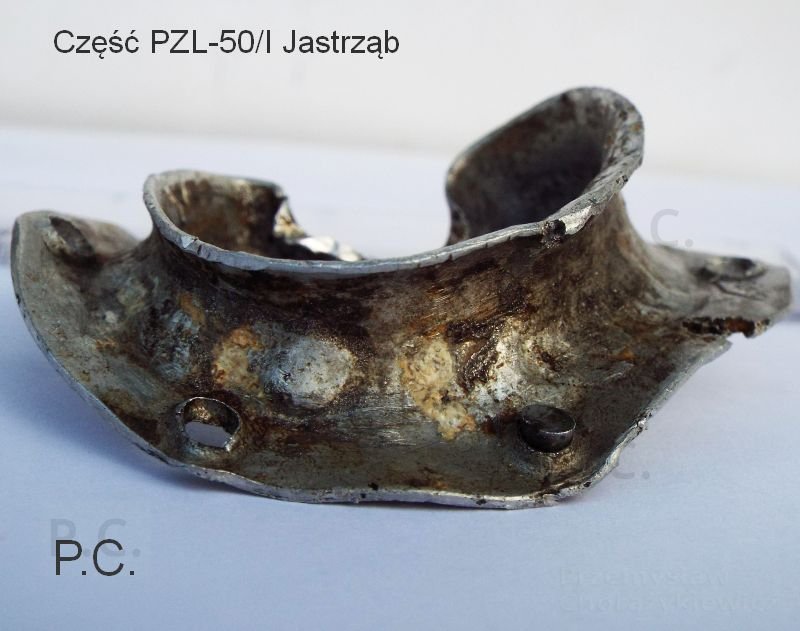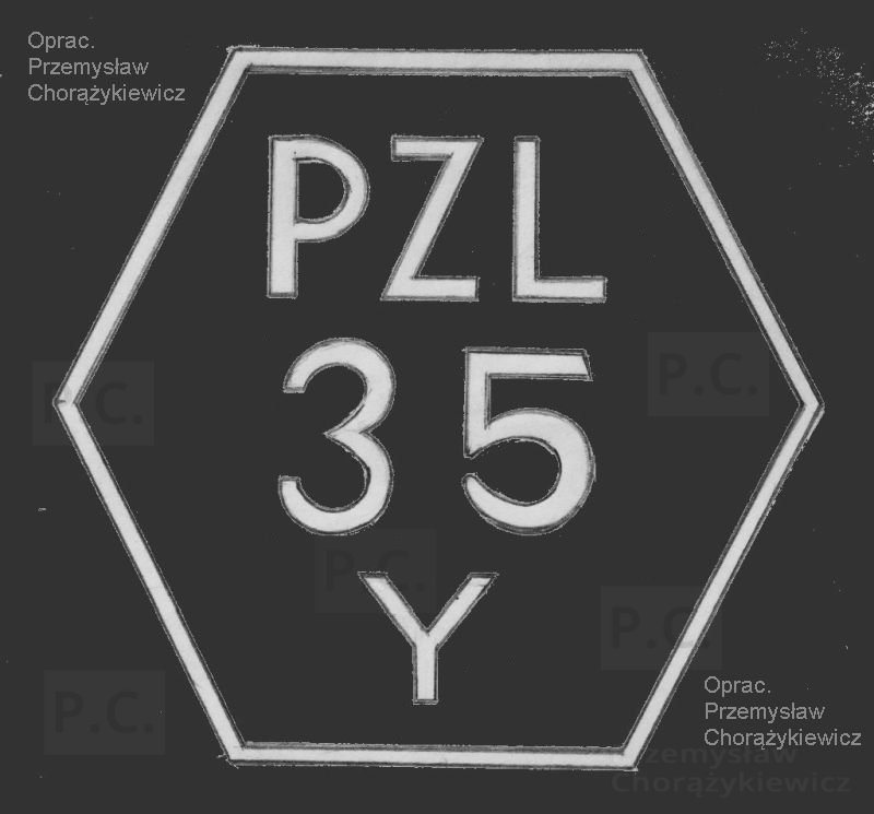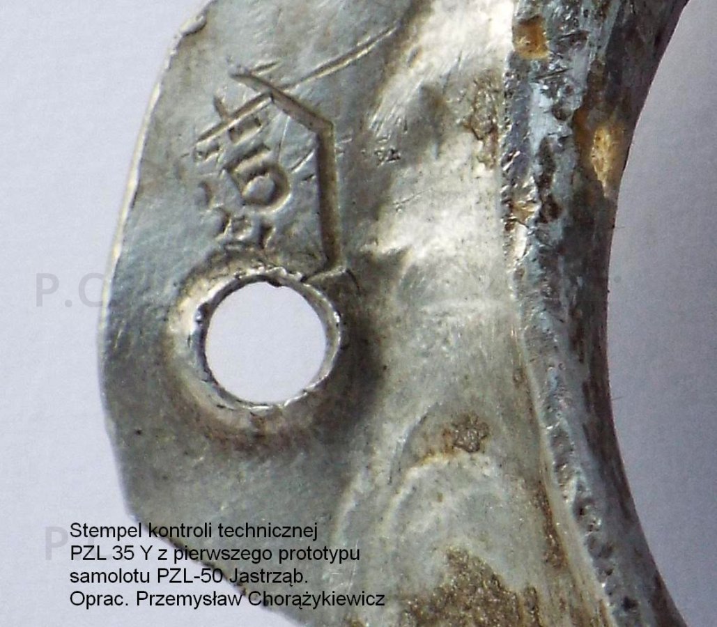 Jedna z części pierwszego prototypu samolotu PZL-50 Jastrząb znakowana stemplem kontroli technicznej (kontroli jakości). Jest to typowy stempel – PZL 35 Y w sześciokącie o wys. ok. 7 mm. Litera P jest nieodbita, na literach ZL jest rysa. Część jest nieco zniekształcona; składa się z dwóch duraluminiowych elementów zespawanych ze sobą. Ma pięć otworów na nity z łbem wpuszczanym (nitowanie na gładko), z których zachował się jeden.