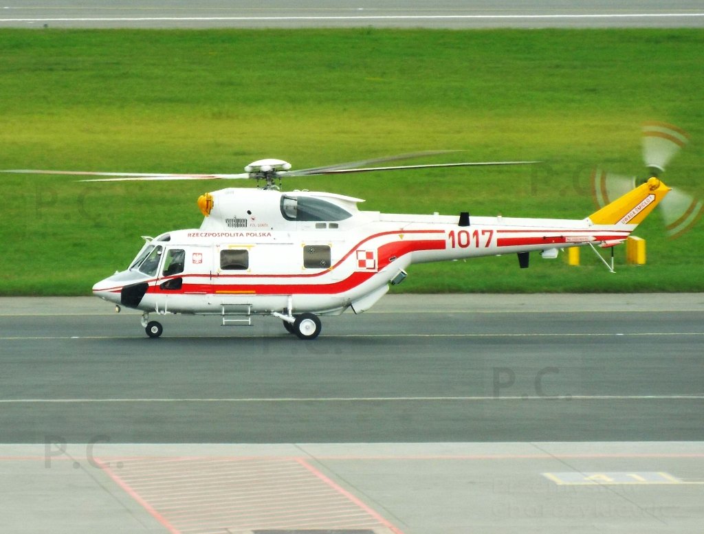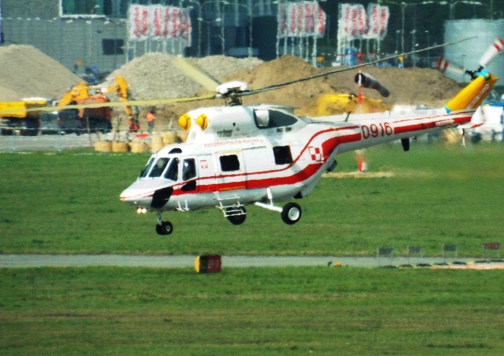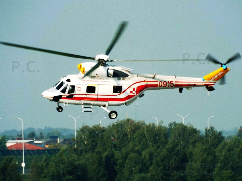 Some W-3 Sokół helicopters for carrying VIPs, including foreign visitors. The numbers are 0915, 0916, 0618, 1016 and 1017. The first photo shows 0915 taxying in rainy weather.